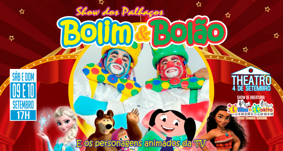 - Tá na hora do seu pequeno se divertir! 01 Ingresso para o “Bolim & Bolão e Personagens Animados da TV”, de R$30,00 por R$15,00. Dia 09/09 ou 10/09, às 17h, no Theatro 4 de Setembro!