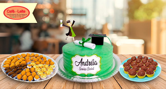 - Oferta dá direito a Bolo (para 35 pessoas) + 150 salgadinhos + 50 docinhos no Café com Leite;