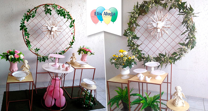 - Kit festa: 3 mesas | 1 arco redondo | 5 bandejas | 1 jarro com flores artificiais (diversos modelos);
