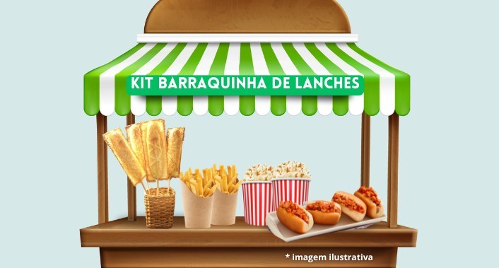 - Oferta dá direito a: Barraquinha de Lanches: 75 Crepes + 75 Batatinhas + 50 mini hambúrguer + 50 Mini Hot Dog + 30 algodão doce (copo) + Pipoca grátis com a Kits Festa;