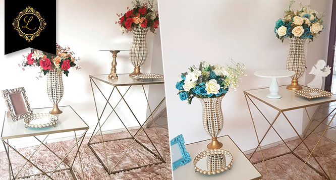 - Oferta dá direito a Kit Festa com 02 mesas geométricas, 01 vaso em pedraria G, 01 vaso em pedraria P, 02 arranjos artificias para os vasos, 03 doceiras, 01 tapete na Donnalu Decore;