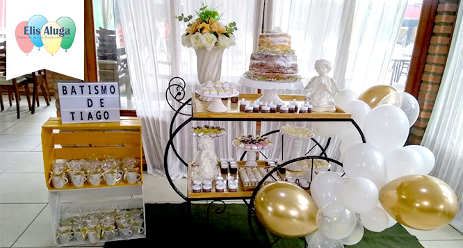• Oferta dá direito Kit com 1 mesa de metal e madeira OU três mesinhas de madeira OU carrinho + 3 bandejas para docinhos + 1 suporte para bolo + 1 jarro com flores OU bola de grama + 1 personagens tema ou light box na Elis Aluga;