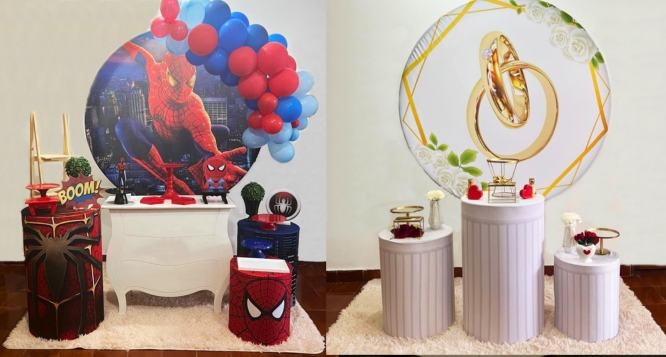 • O Kit Festa na Sonhos e Festas – Pegue e Monte inclui: 1 Painel redondo + 3 cilindros + 1 tapete + 1 mesa fake + 1 escada de madeira + 2 doceiras + 3 bandejas + 1 suporte para bolo + 3 display + 2 jarros com buxinhos ou Flores na Sonhos e Festas – Pegue & Monte;