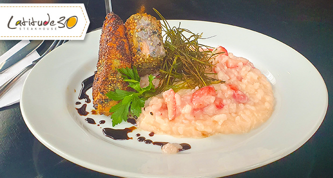 • Oferta dá direito a Salmão Grelhado em Crosta de Gergelim com Risotinho de Morango no Latitude 30;