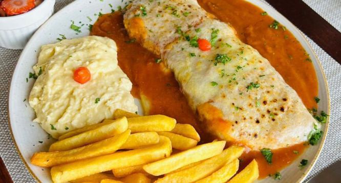 - Prato Executivo de Frango a Parmegiana (150 g de Filé de frango com molho de tomate e queijo gratinado + Purê de batata + Arroz branco + Batata Frita + Salada verde) no Santa Esquina Restobar;