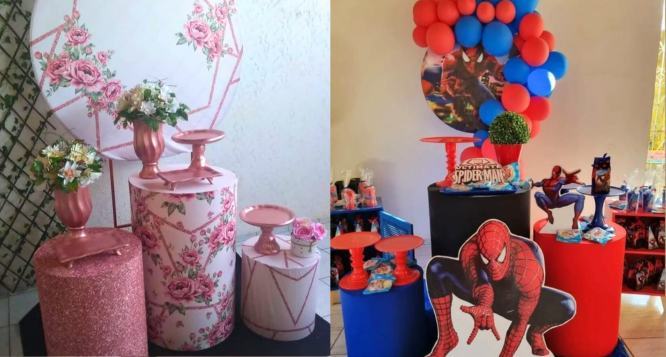 - Oferta dá direito a: Kit Festa: 1 painel + 3 cilindros + 1 tapete pequeno + 5 bandejas + 1 jarro com flores ou bola de grama + 1 suporte de chão para balões por Elis Aluga;