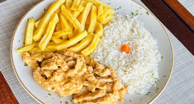 Strogonoff de Carne ou de Frango (Filé em cubos) + Arroz branco + Batata frita