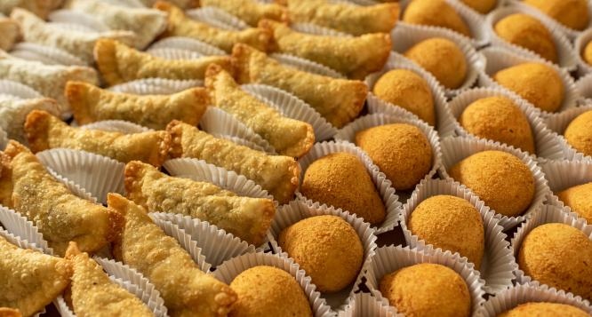 - Sabores dos salgadinhos: Coxinha, Pastéis de carne, Risole de pizza e Bolinha de carne;