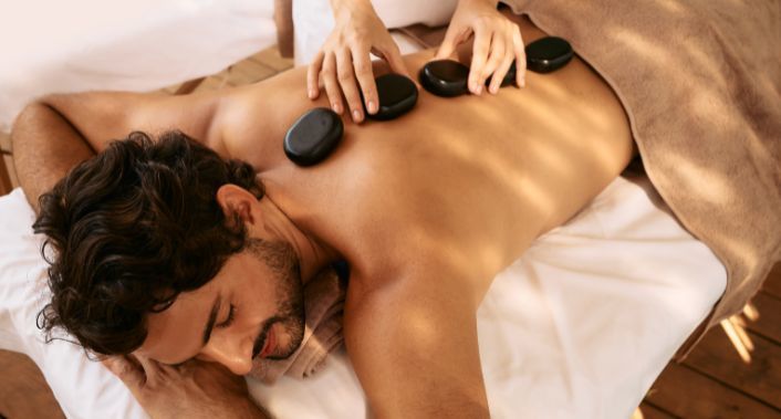 Massagem relaxante corporal com pedras quentes + Escalda-pés relaxante com sais